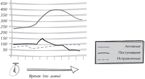Все диаграммы или аналитические технологии могут указывать на одну из двух вещей: осталась большая часть работы или осталась меньшая ее часть. Например, если количество активных ошибок продолжает возрастать, это означает, что проблемы накапливаются быстрее, чем убывают, и новые проблемы обнаруживаются в неизменно высоком темпе. И наоборот, если количество активных ошибок снижается, работа идет на убыль быстрее, чем обнаруживаются новые проблемы. В любом случае цель анализа тенденций заключается в том, чтобы для любой качественной характеристики понять, в каком из трех состояний она находится.