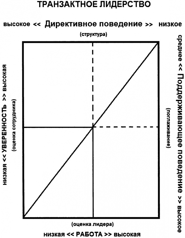 На диаграмме («транзактное лидерство», см. выше) у сотрудника средний уровень уверенности в выполнении какой-то конкретной задачи. Горизонтальная пунктирная линия направлена на умеренный уровень необходимых поглаживаний. Вертикальная пунктирная линия направлена на умеренный уровень руководства, что тоже необходимо. Сотрудник выполняет задачу на среднем уровне и, следовательно, нуждается в среднем уровне руководства.