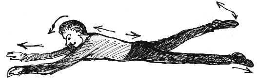 Важно почувствовать вытяжку тела сразу с двух сторон: потягиванием его вместе с головой (слегка вращая ею) за счет упора на локти — и вытяжку позвоночника вытягиванием ног с небольшими подъемами их, как показано на рисунке. Хороший вариант — делать то же самое на краю кровати или дивана так, чтобы одна нога вытягивалась не только вверх, но и вниз, а локти держать при этом твердо.