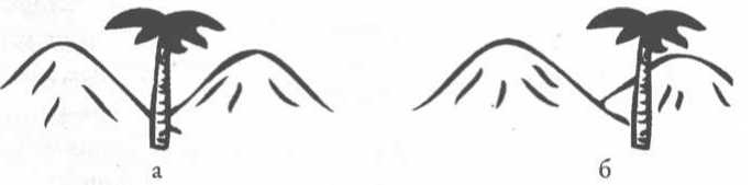 Рис. 8.2. Два холма с деревом посередине: а) мозгу не нравятся уникальные точки зрения; б) мозг предпочитает более типичные