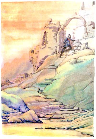 Аларм кивнул и, не оглядываясь, пошел вдоль берега. Пройдя цепь невысоких скал, он увидел на вершине одного из холмов большой каменный замок. Его могучие башни были разбиты, в стенах зияли дыры. Казалось, замок выдержал не одну осаду, но противнику так и не удалось разрушить его до основания.