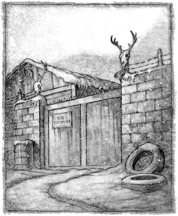 Свернув на полигон на окраине города, куда сгоняли старую технику, Джесс поехал, старательно объезжая выбоины, между старыми, облупившимися ангарами. На задах полигона тянулась стена из шлакобетонных блоков, увенчанная колючей проволокой и обвешанная оленьими черепами. Джесс нашел железные ворота, утыканные поверху битым стеклом, остановился, посигналил два раза и помахал в камеру наблюдения, установленную над воротами.