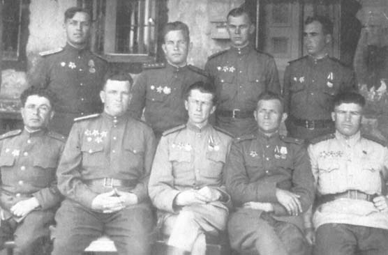 1028 артполк. Сидят слева: прокурор дивизии, начштаба Шлямин, командир Рогоза, замполит Устинов, парторг Аржатский. Стоят: помначштаба Кочелаба, командиры дивизионов: Михин, Выскребенцев, Ярышкин